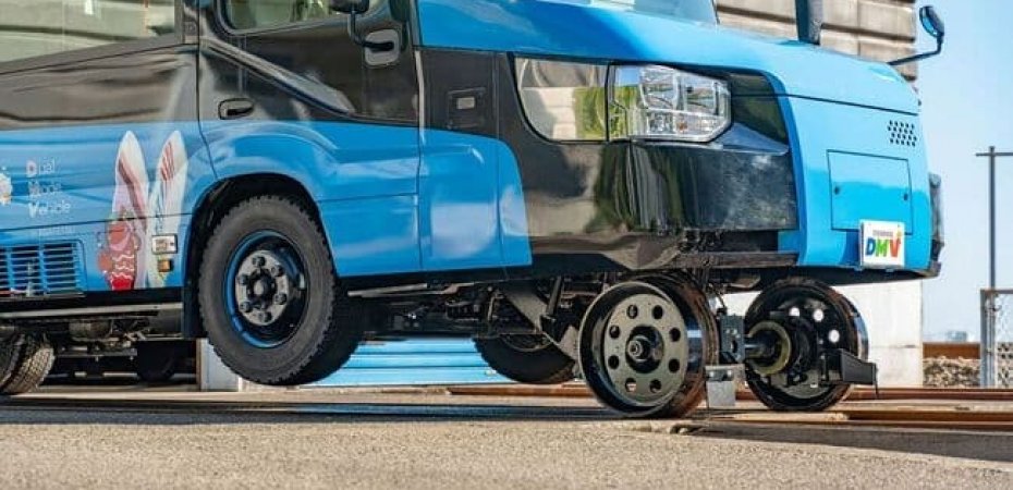 ويمكن لهذه المركبة ذات الوضع المزدوج، أو DMV، أن تتحول من حافلة تسير على الطريق إلى قطار يسير على المسار في 15 ثانية بفضل العجلات الفولاذية التي يمكن إنزالها على المسار بضغطة زر.