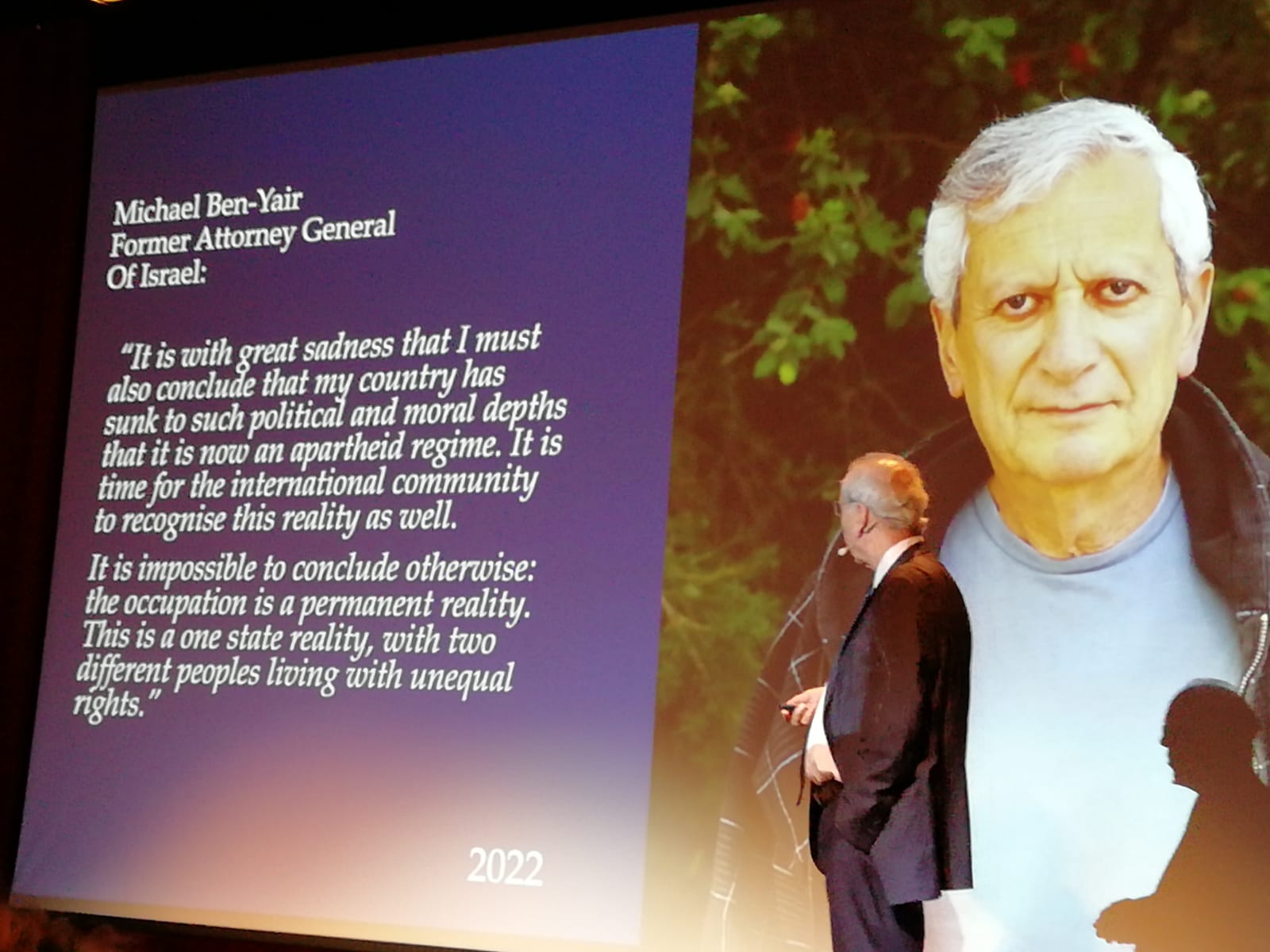 وفي معرض مداخلته وجه سؤالا إلى السيد لينك حول ما جاء في تقريره في الفقرة الخاصة بتعريفه العنصرية هي تعني هيمنة مجموعة على مجموعة اخرى من خلال ممارسة التمييز والاضطهاد، متسائلا، إذا كانت إسرائيل أعلنت عن نفسها في العام ٢٠١٨، بأنها دولة يهودية استنادا إلى قانون القومية، وتمارس القوة والاضطهاد والتمييز والهيمنة على شعب آخر هو الشعب الفلسطيني، فالأحرى بنا أن لا نكتفي بوصف إسرائيل بدولة الابرتهايد، بل بالدولة النازية، التي تعني هيمنة أمة على أمة أخرى بنفس الأدوات المشار إليها سابقا.